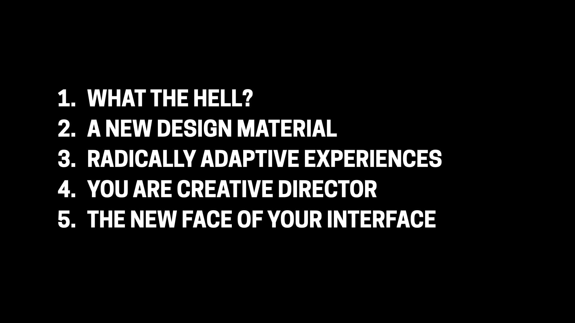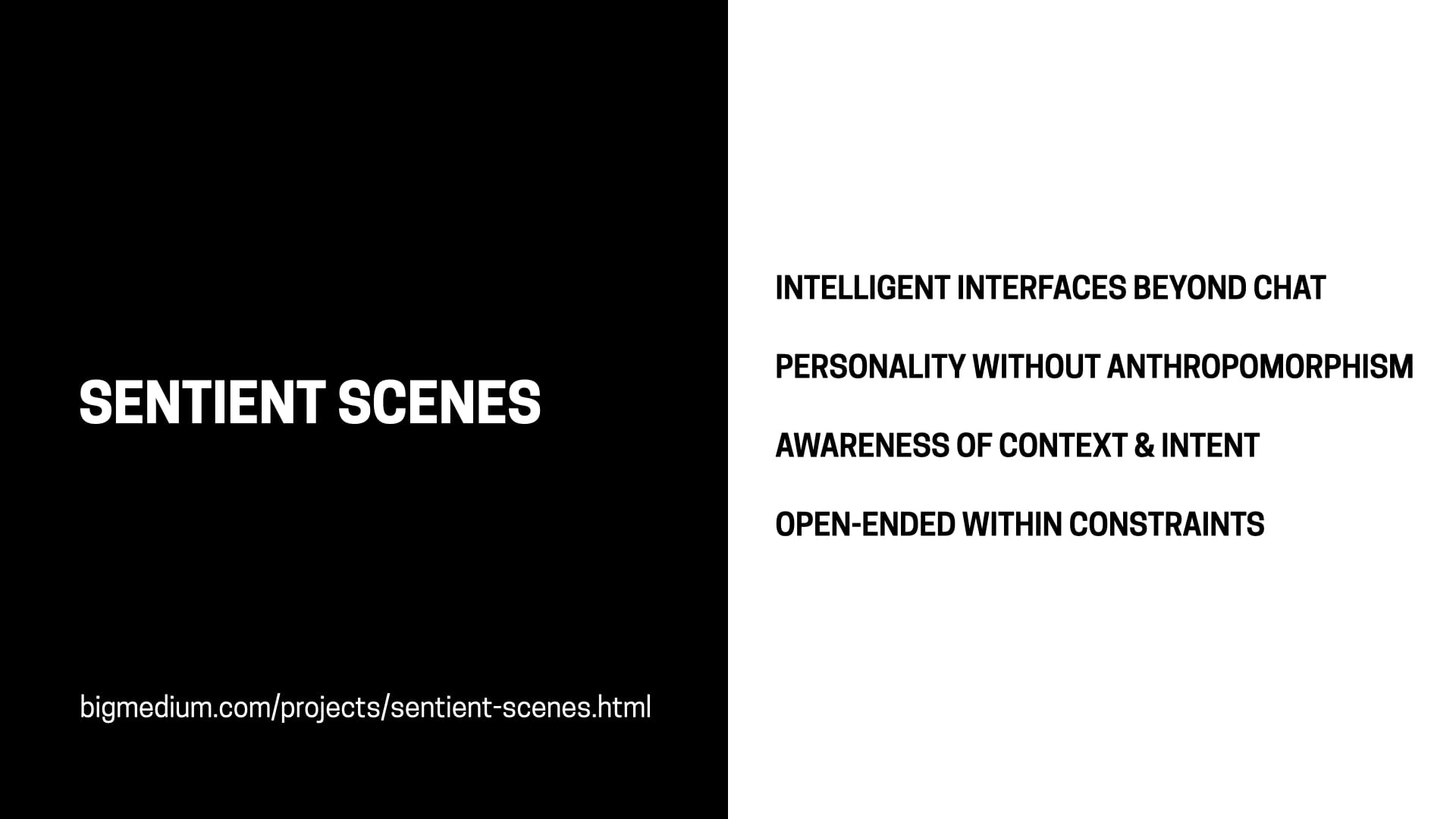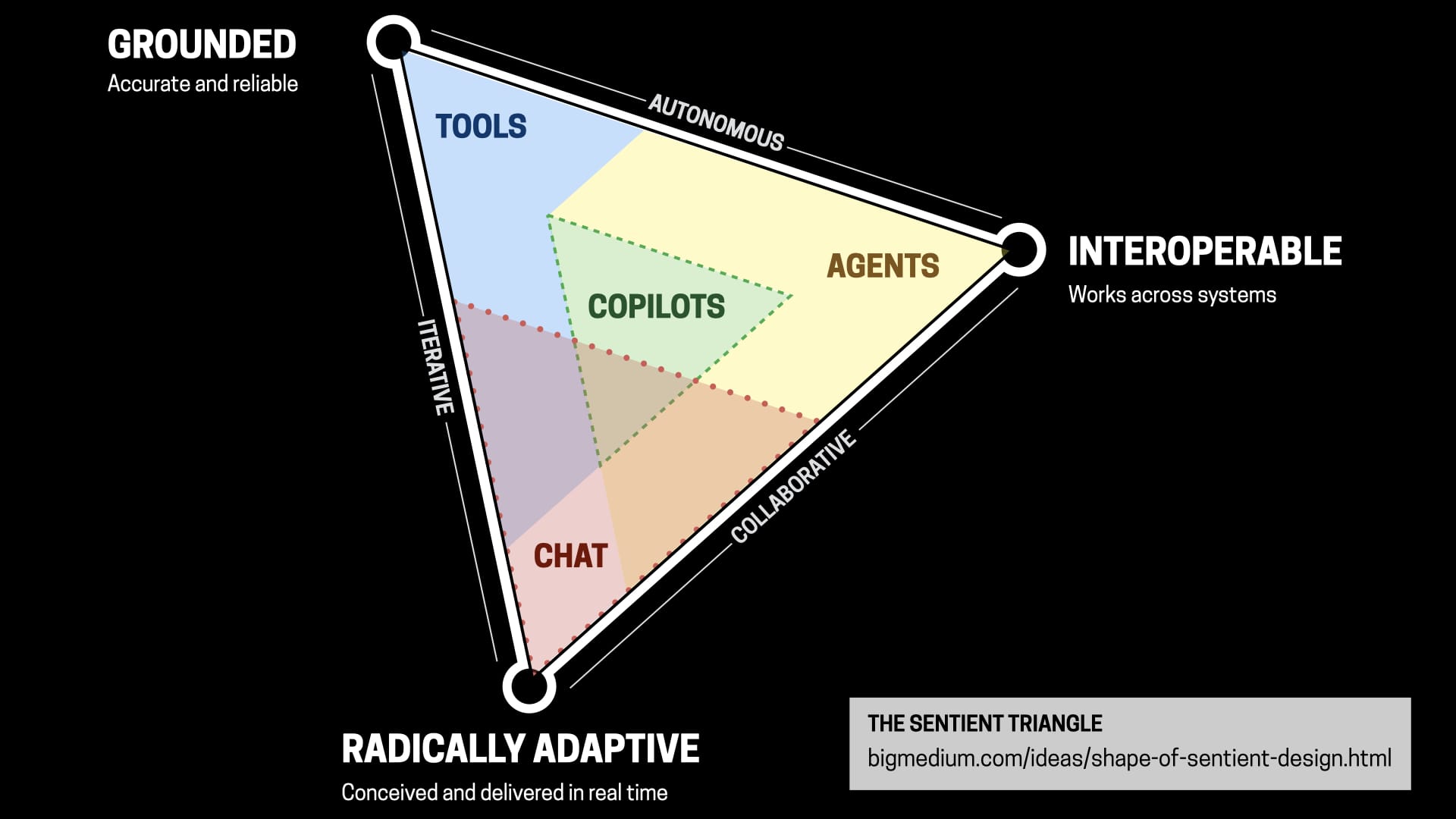 We’ve talked about a few of these already—bespoke UI, NPCs, intelligent canvas. If you’re interested in finding out more of these, you don’t have to wait for the book. You can also just type into Google “the shape of Sentient Design,” and an article will come up giving you an overview of the Sentient Triangle. (This is a great use for a text box!)