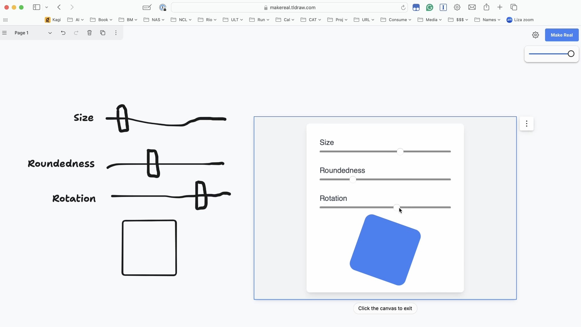 So I select what I drew here and I click Make Real, and then after a few seconds, it actually builds the interface. This is more than just drawing it or building the UI widgets. When I click in here and start interacting with it, it actually works! It inferred from my sketch what the thing should do and how it should behave. I’ve just sketched a little miniature application here to actually do its thing.