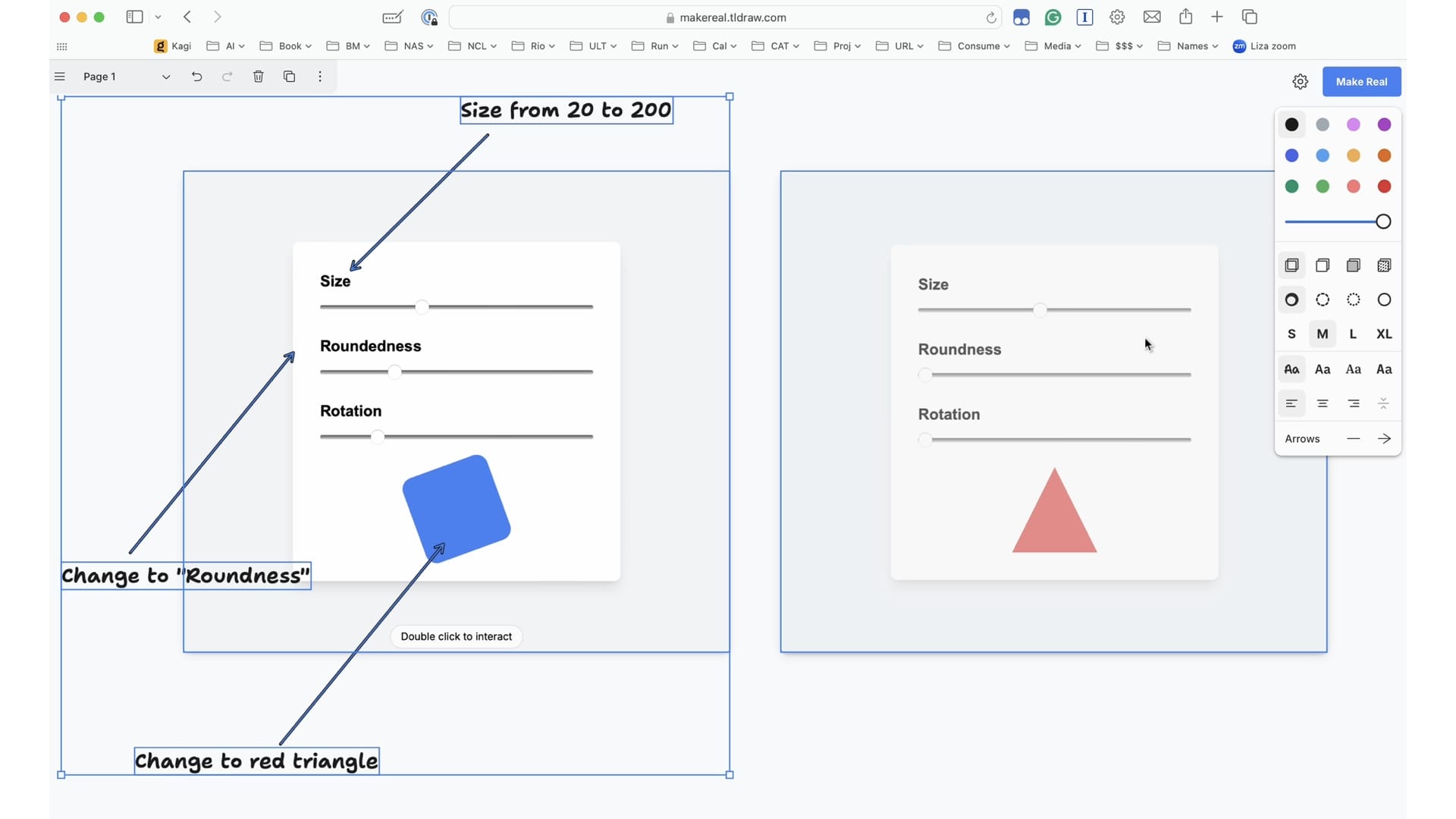 When I select it all and then click make real, it generates another version based on my notes. And you can see here, oh, roundedness has been changed to roundness. And the scale under the hood for size has changed from 20 at the left to 200 on the right. And it’s a red triangle.