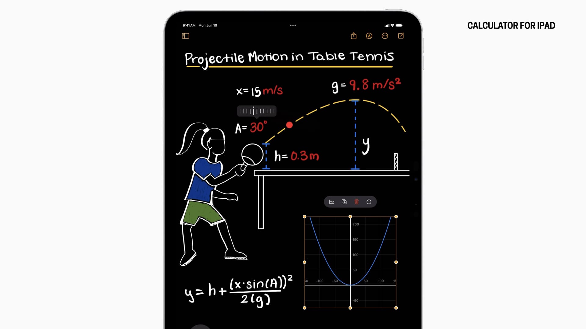 The iPad calculator app that came out last fall has a feature called Math Notes that lets you draw equations and make them interactive. So here at the bottom left, if I turn that into an equation by making y equals, now I can add a chart to this. Great, that’s charting what that is. Those scribbles up at the top though, those are actually variables. So if I tap the 30, I can change that and you can see the graph is changing.