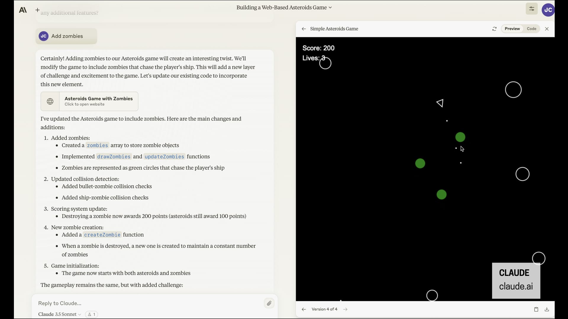 This begins to approach on-demand applications. Claude is pretty amazing at this. I’m sure some of you have played with this. In chat, you can tell it to make an app and start using it and improving it right away. So here I told it to build an asteroids game that I could play in the browser and in seconds I was playing it during the chat and then asking it to make changes. So I told it to add scoring and sound effects and then I typed in add zombies. I didn’t even know what that would do. I had nothing in mind, but it added these green asteroids that started chasing me around. It created this on-demand thing that didn’t exist a few minutes ago and was just now tailored to me.