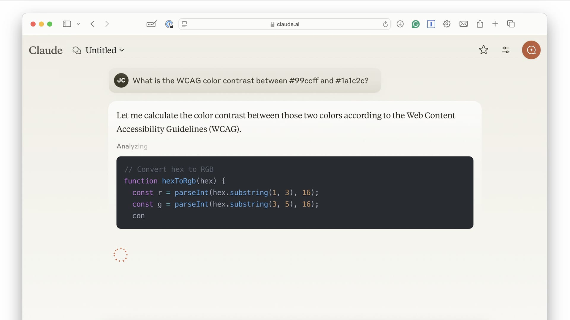 I also love Claude—and while Josh is going around playing his little Gen X games. I’m going to do some work. So I asked Claude to check the accessibility contrast between two colors. And on its own, it decided to write out this whole application for the task. I didn’t ask for it, but because that’s what it needed to complete the task, that’s what it built.