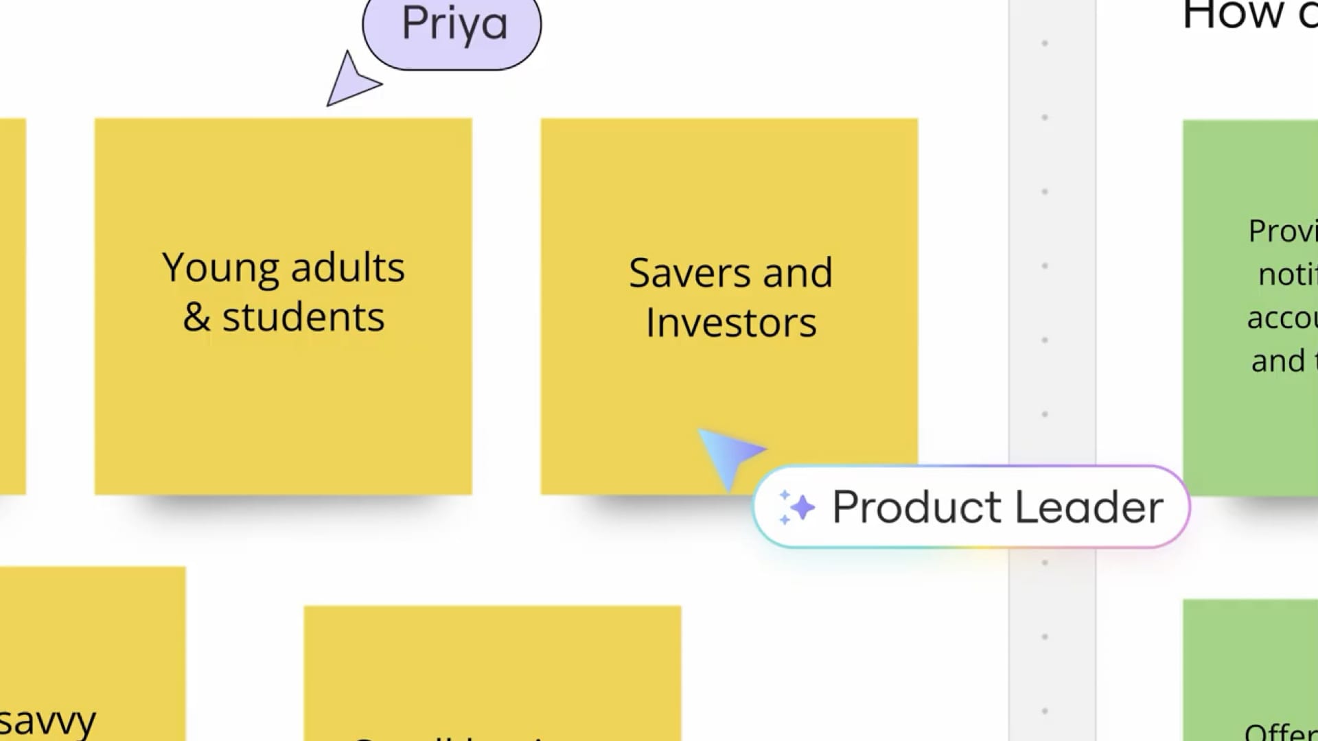 Miro has a feature called sidekicks. They do things like give feedback on your content or suggest new content. We could be doing this just in a chat box, and ask it in chat to give me feedback on these things or create new suggestions. But instead Miro does it with an experience where the system acts as a user.