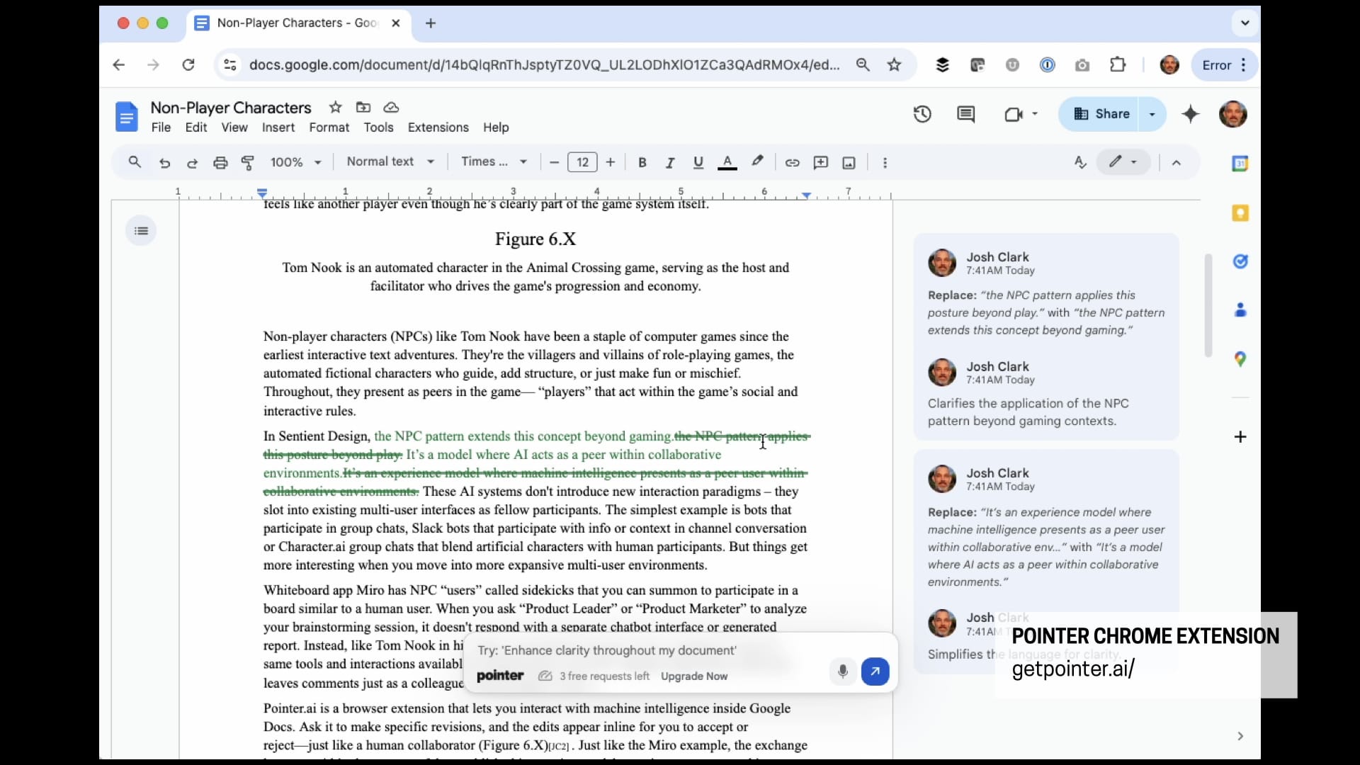 Here’s another example, a Chrome extension called Pointer that works in Google Docs. I’ve asked it to review my document for technical accuracy, and then it goes in and it makes suggestions just like a human editor would. I don’t have to go to some separate chat interface. It behaves as an NPC, a non-player character within the rules of the application.